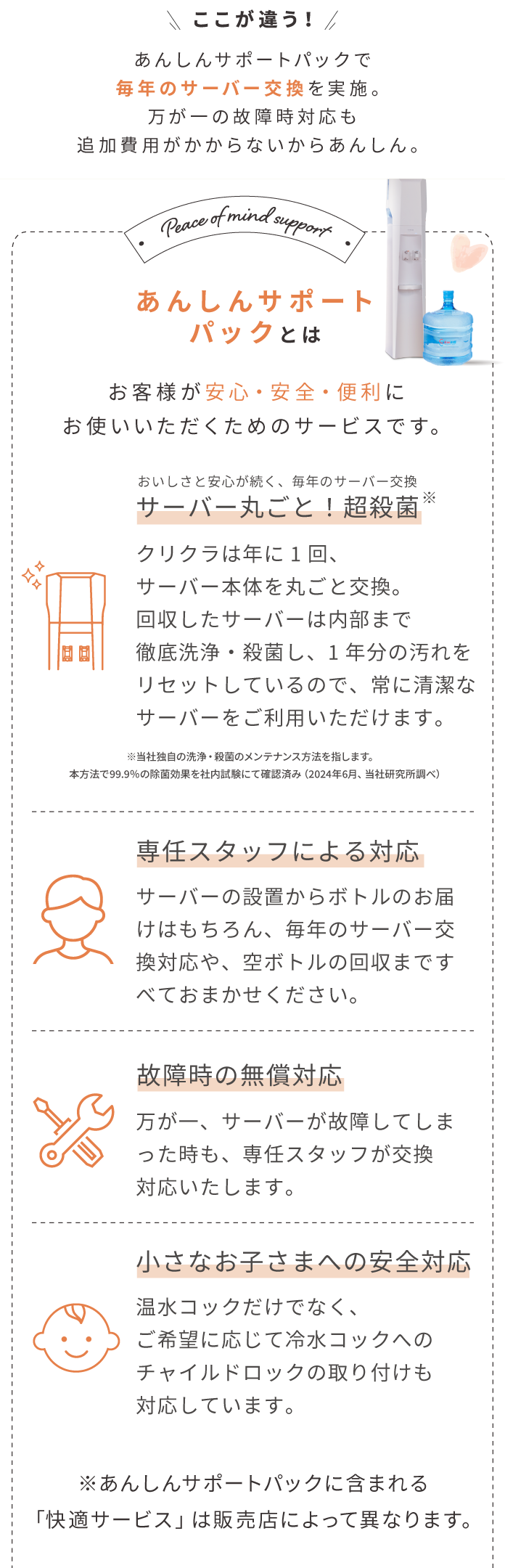 それは「お届けする水の品質を維持するためには、サーバー本体の衛生管理も不可欠である」という20年以上にわたり、安全でおいしい水を提供し続けてきたクリクラの「安心・安全」に対する徹底した姿勢がここにあります。