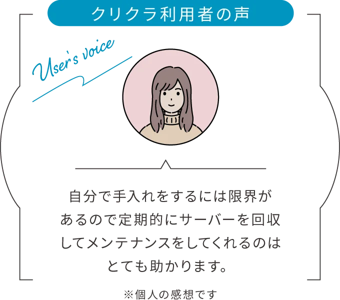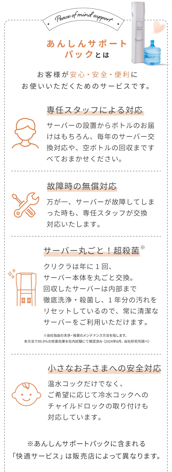 それは「お届けする水の品質を維持するためには、サーバー本体の衛生管理も不可欠である」という20年以上にわたり、安全でおいしい水を提供し続けてきたクリクラの「安心・安全」に対する徹底した姿勢がここにあります。